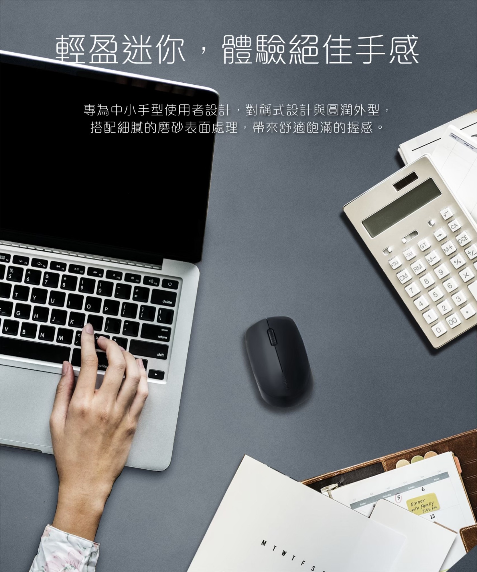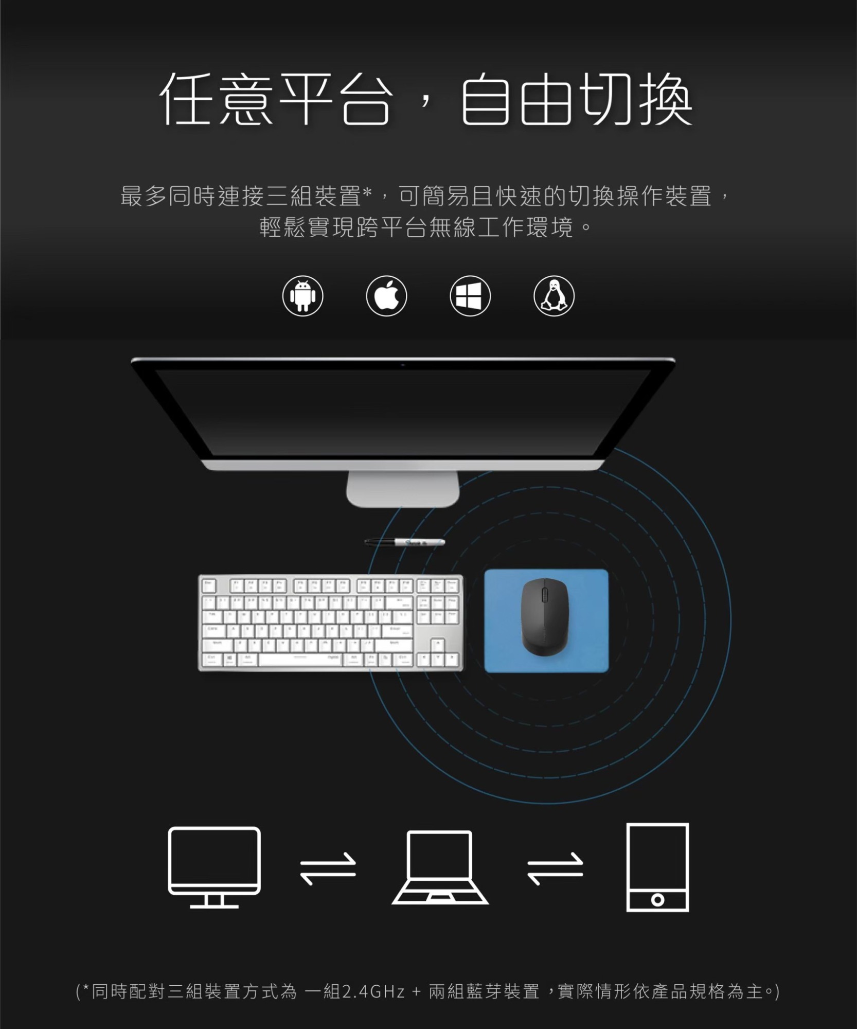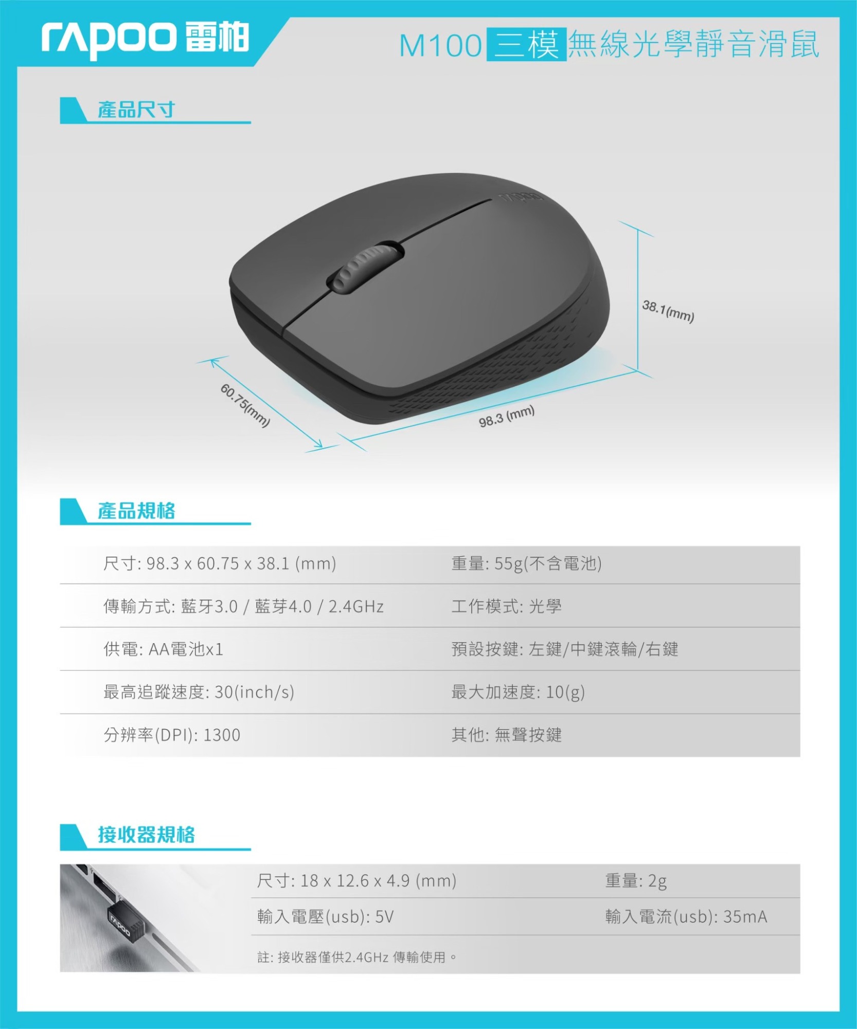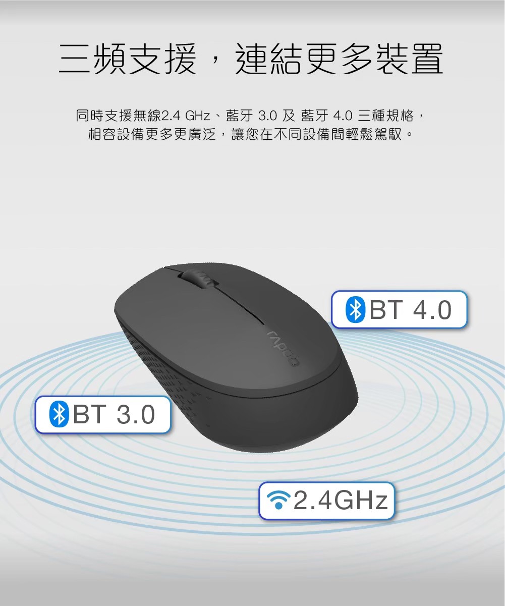 靜音按鍵減少使用噪音 藍牙3.0、4.0和2.4G三模式 多設備適配智能切換 1300 DPI精度的尋跡引擎 長達9個月電池使用壽命