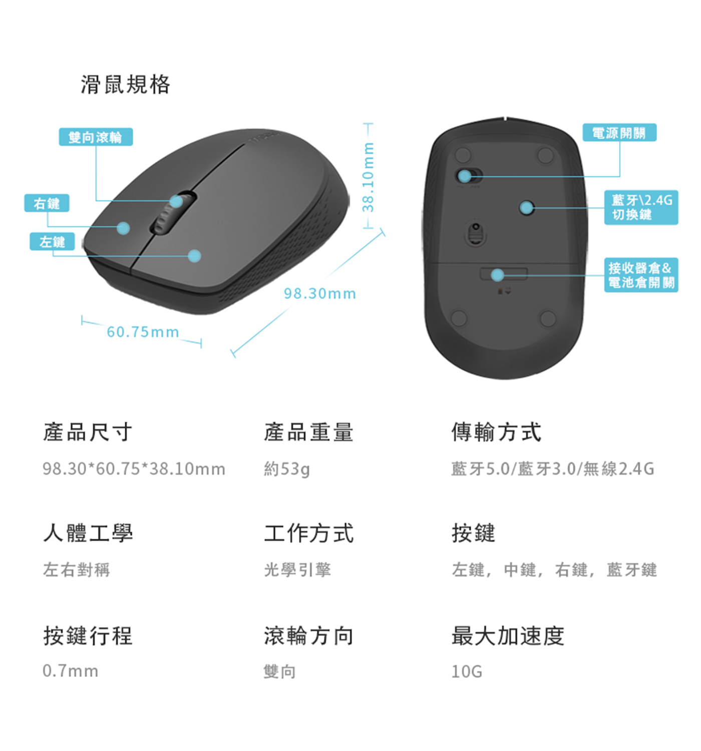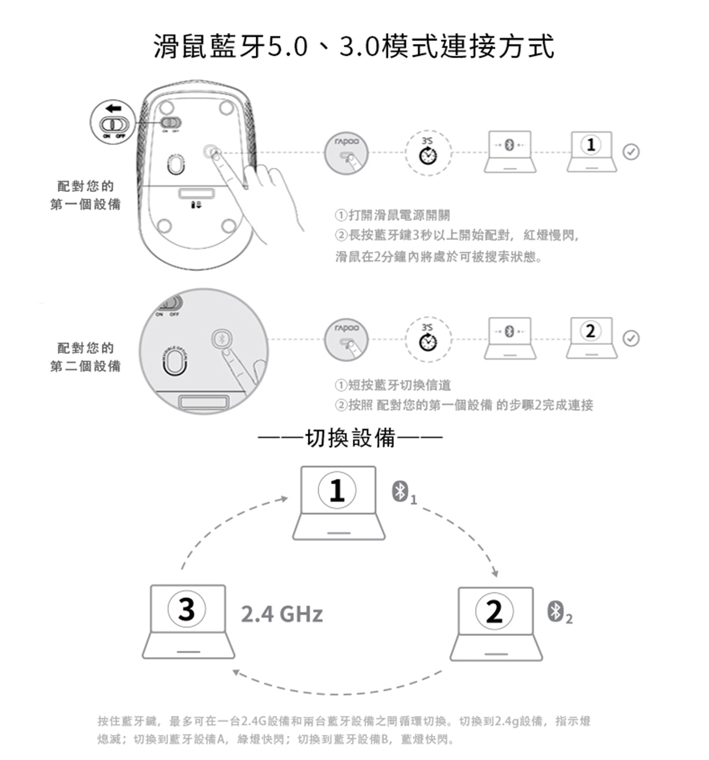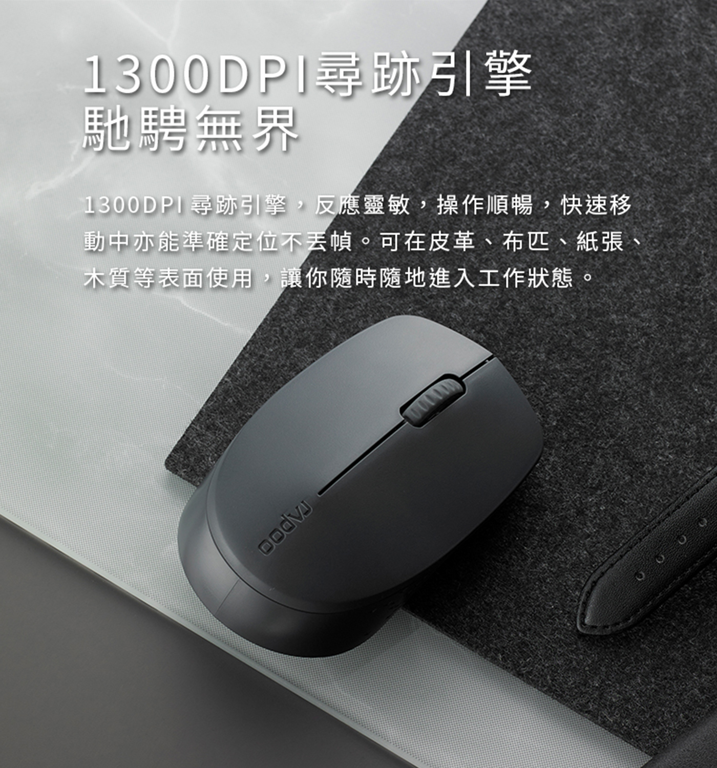 多設備適配智能切換 藍牙3.0、4.0和2.4G三模式 多媒體控制 1300 DPI精度的尋跡引擎
