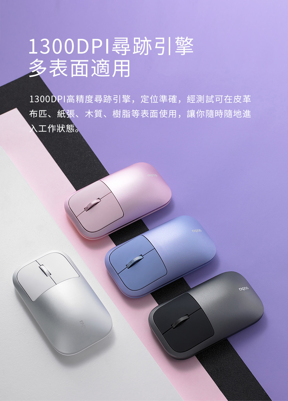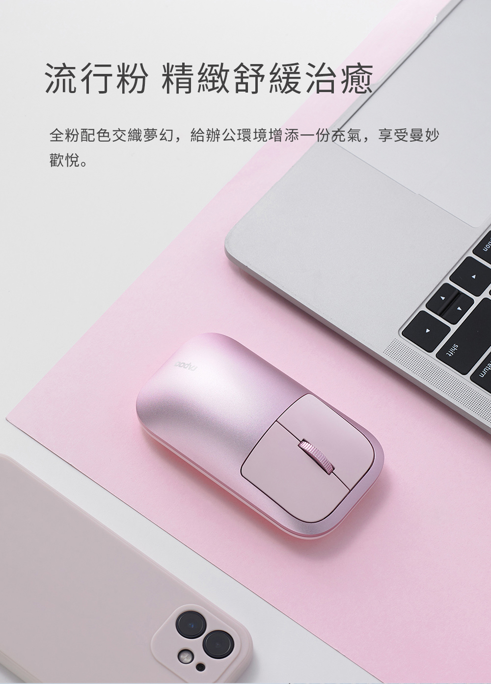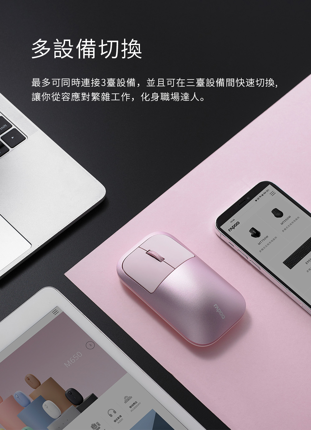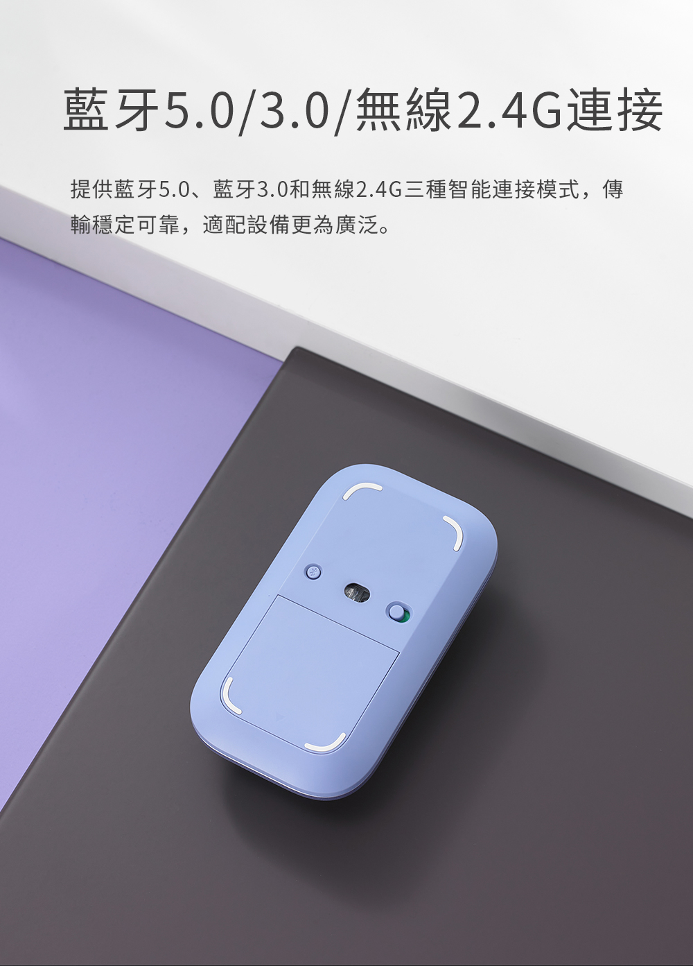 【繽紛系多模金屬質感無線靜音滑鼠 】 *藍牙3.0、5.0和2.4G三模式 *多設備適配智慧切換 *1300 DPI精度的尋跡引擎 *長達12個月電池使用壽命 * 流行造型金屬質感上蓋設計高雅 * 舒適掌控的人體工學設計背部曲線 *貼心靜音微動