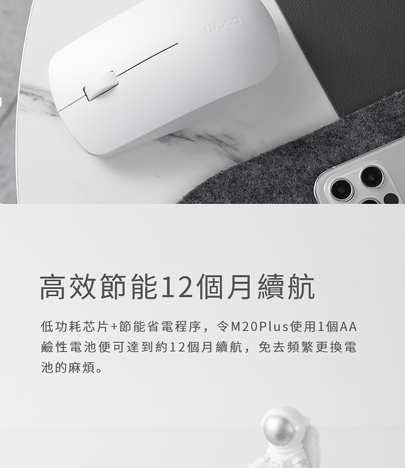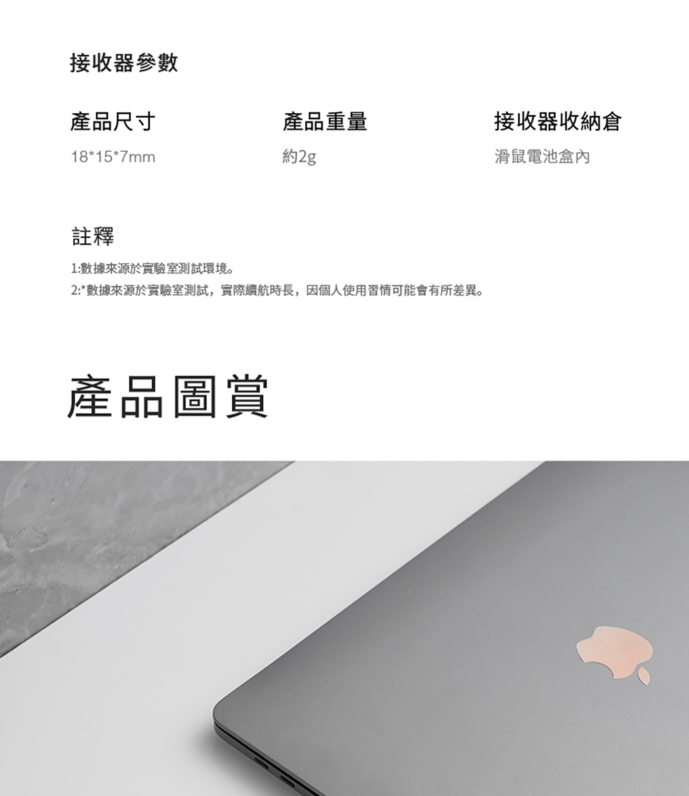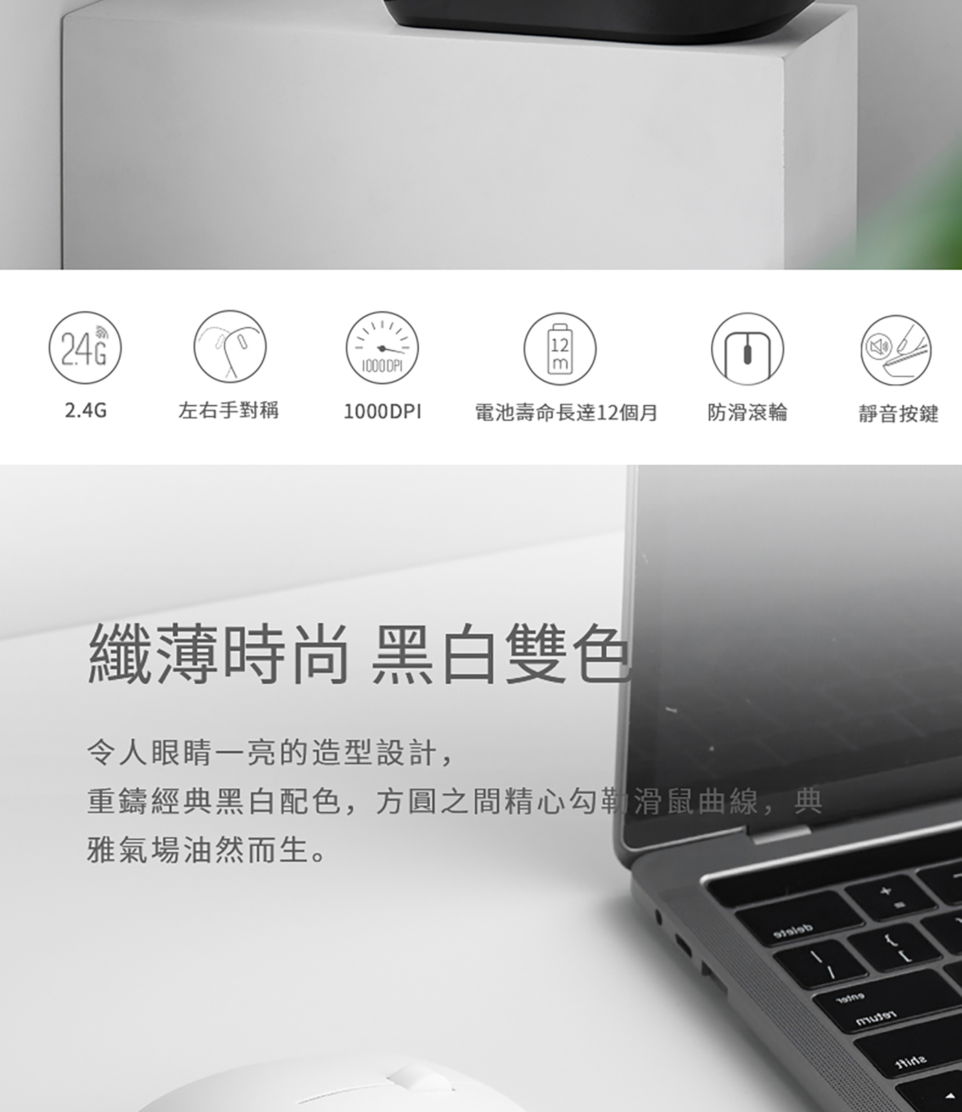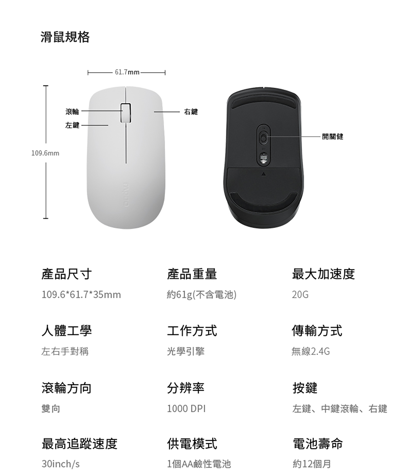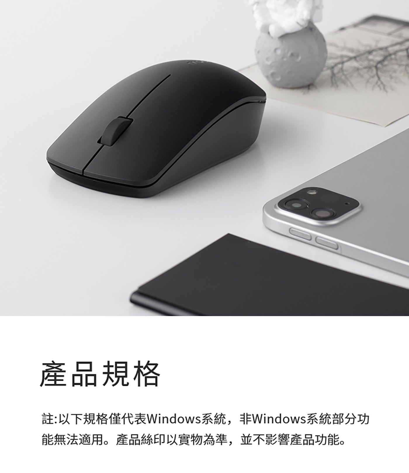 *2.4GHz無線傳輸 *人體工學舒適握感 *摩砂表面質感細膩 *10米連接範圍 *1000DPI高精準度 *電池壽命長達12個月