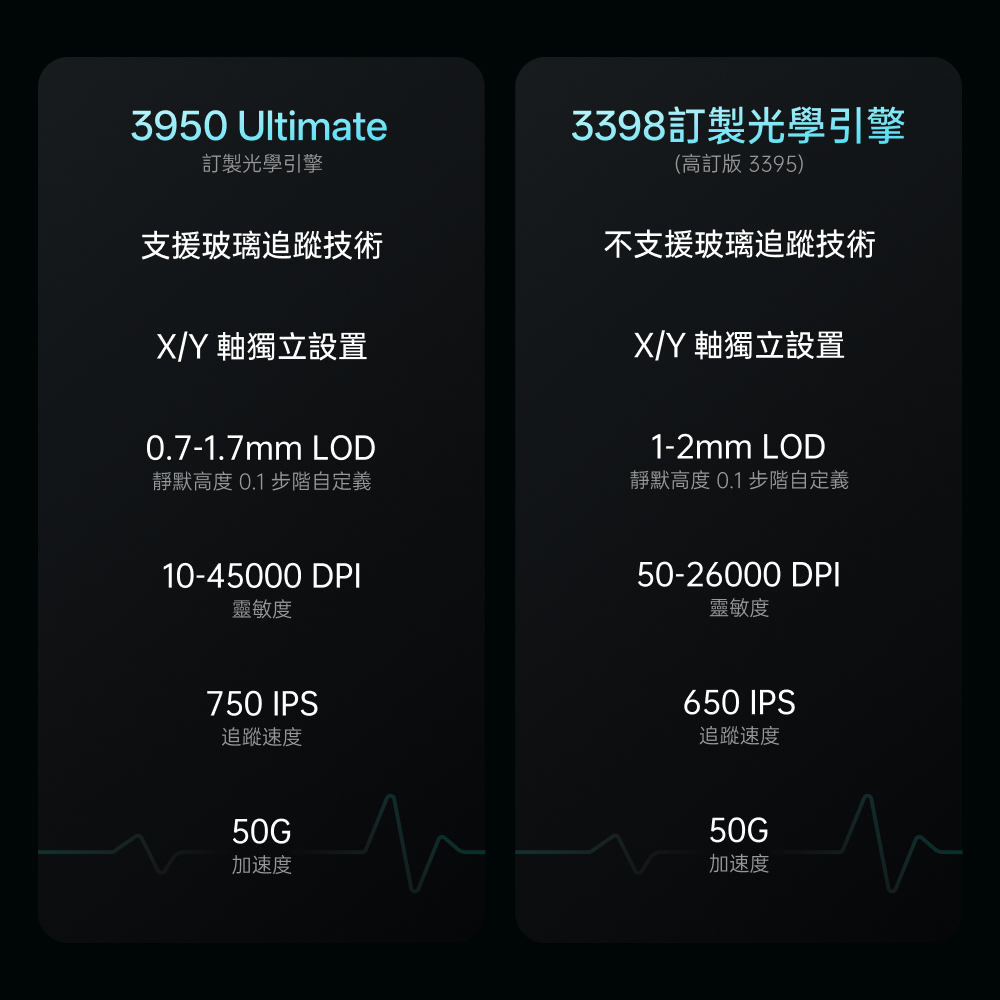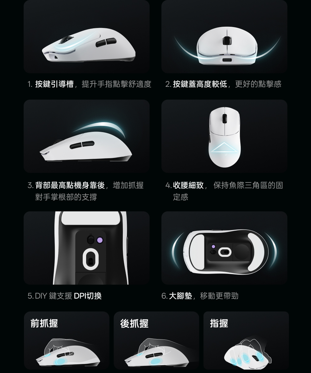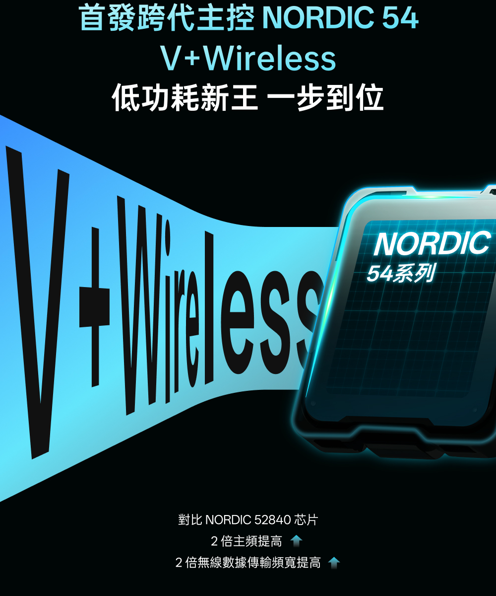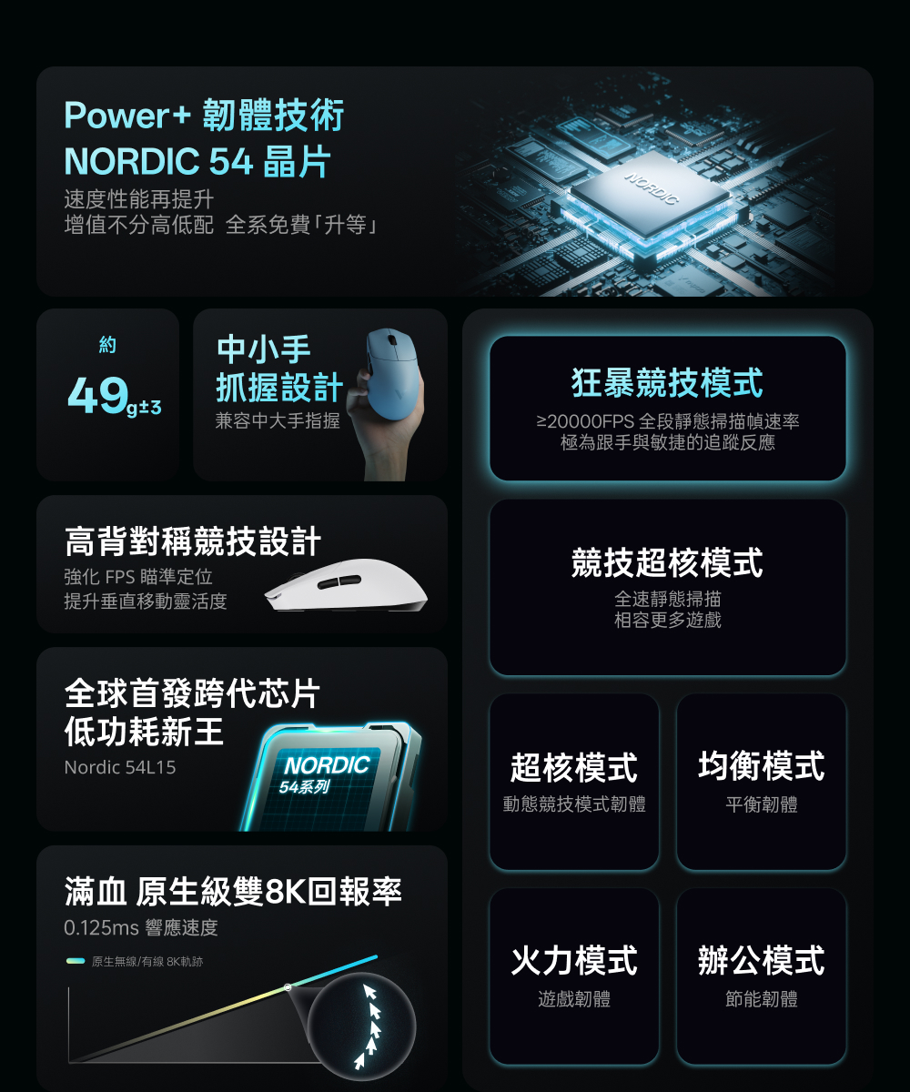 1.NORDIC 54旗艦芯片 2.約49克輕量化設計 3.原相3950 Ultimate訂製引擎 4.雙模雙8K(無線/有線連接) 5.中小手抓握/中大手指握(高背對稱) 6.充電一次750小時續航 7.微型nano 8K接收器,即時電量RGB燈光顯示 8.10-30000DDPI原生DPI靈敏度 9.750IPS追蹤速度,50G加速度,玻璃介質表面追蹤技術