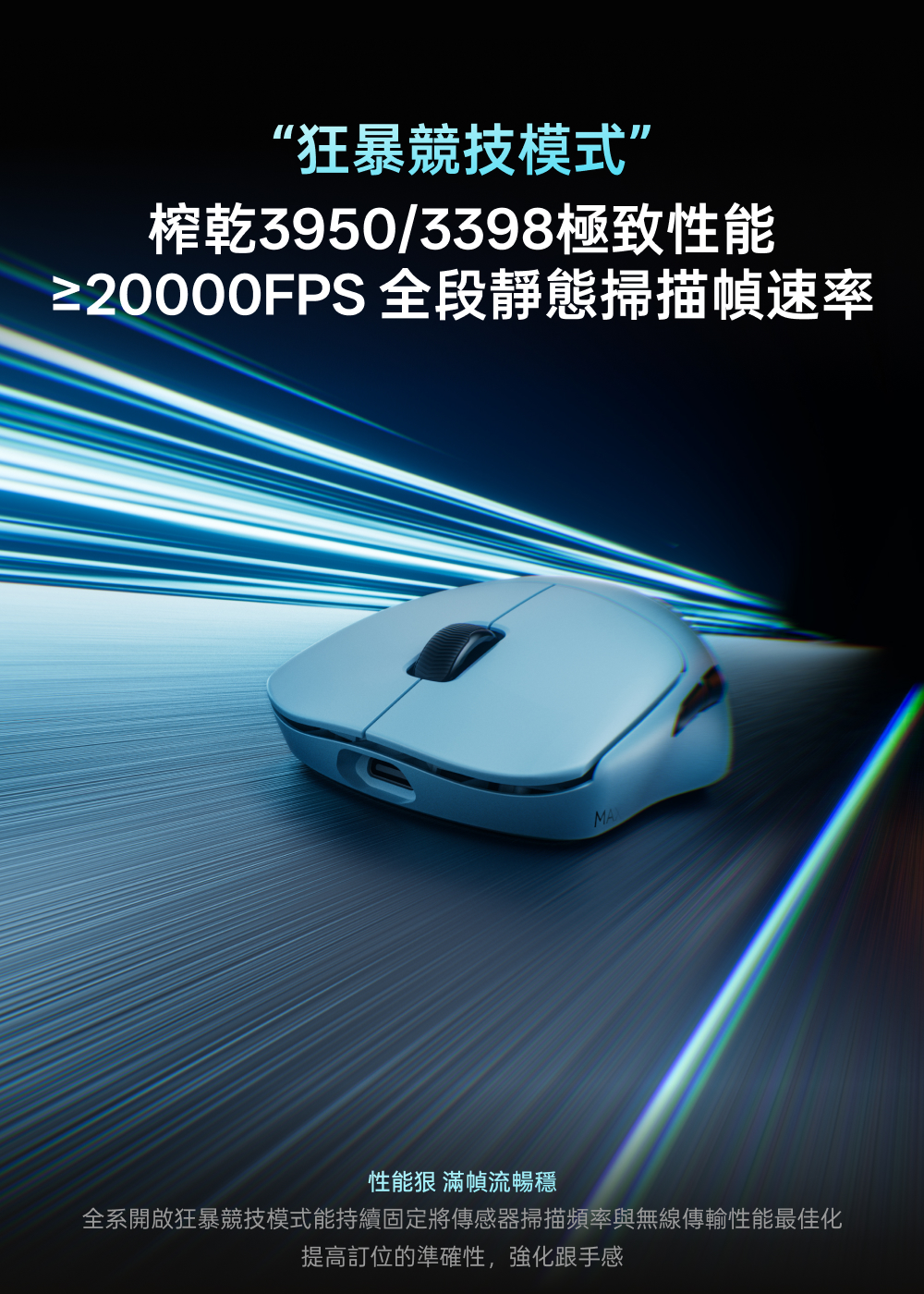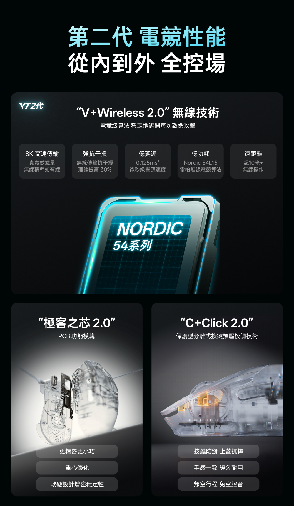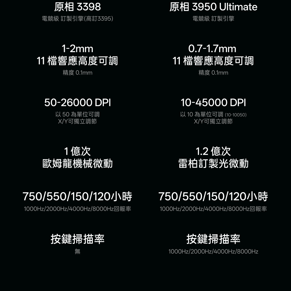 1.NORDIC 54旗艦芯片 2.約49克輕量化設計 3.原相3950 Ultimate訂製引擎 4.雙模雙8K(無線/有線連接) 5.中小手抓握/中大手指握(高背對稱) 6.充電一次750小時續航 7.微型nano 8K接收器,即時電量RGB燈光顯示 8.10-30000DDPI原生DPI靈敏度 9.750IPS追蹤速度,50G加速度,玻璃介質表面追蹤技術