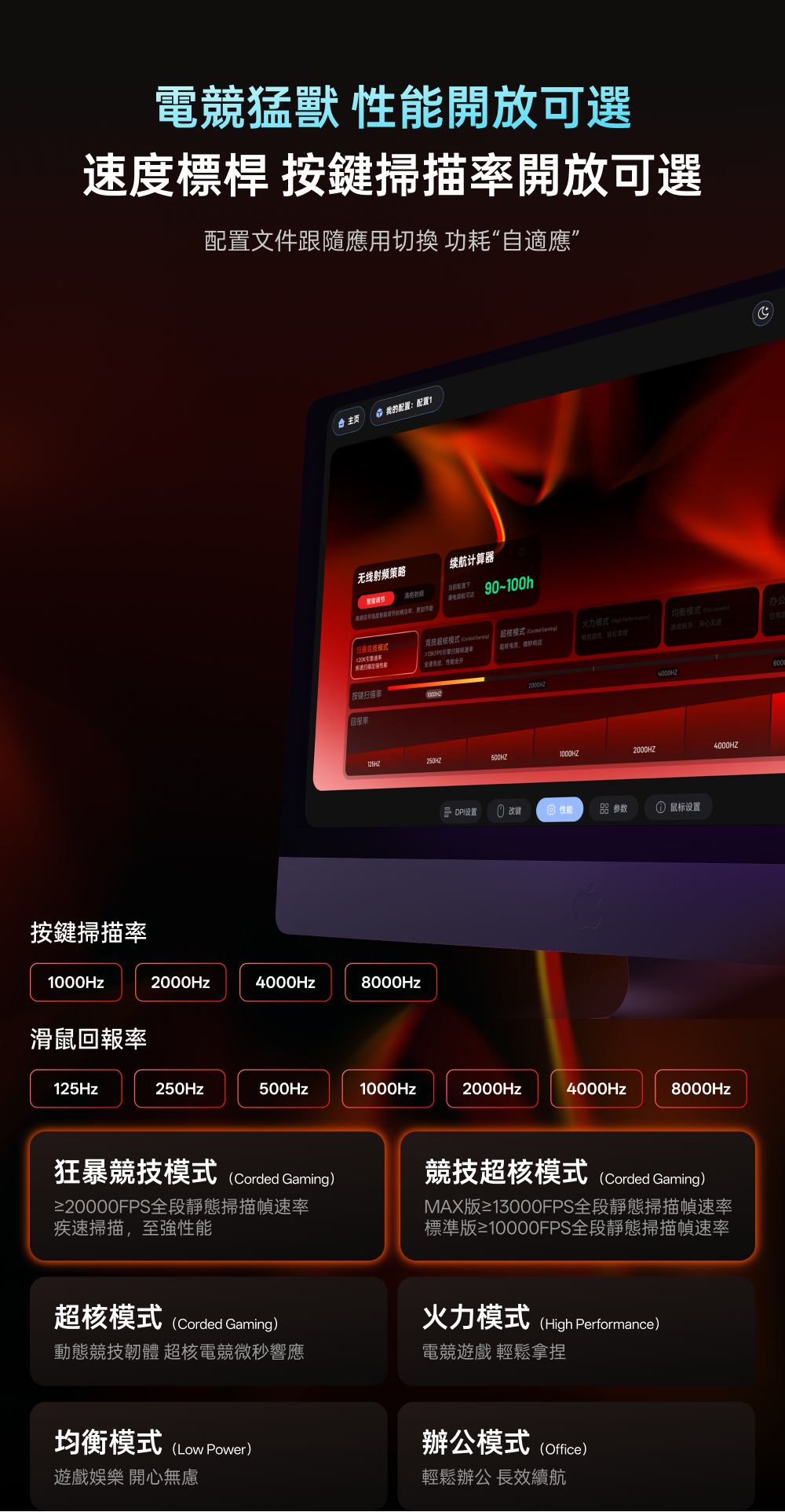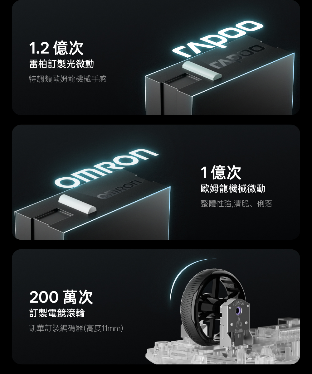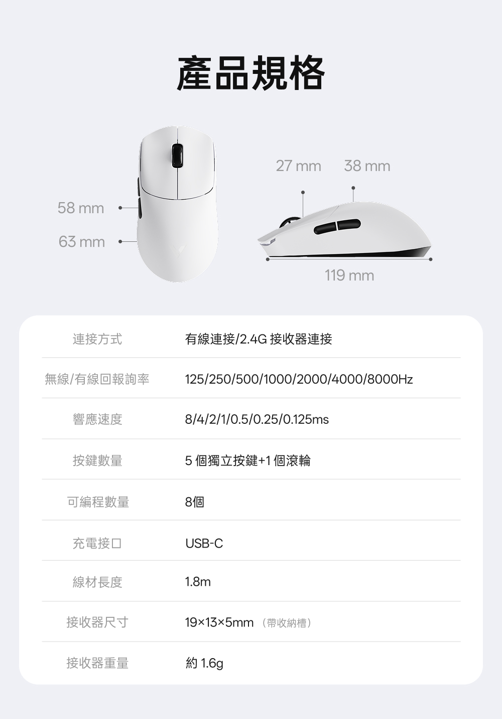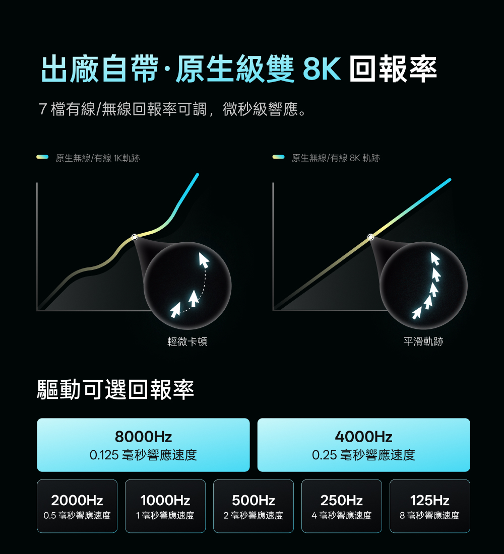 1.NORDIC 54旗艦芯片 2.約49克輕量化設計 3.原相3950 Ultimate訂製引擎 4.雙模雙8K(無線/有線連接) 5.中小手抓握/中大手指握(高背對稱) 6.充電一次750小時續航 7.微型nano 8K接收器,即時電量RGB燈光顯示 8.10-30000DDPI原生DPI靈敏度 9.750IPS追蹤速度,50G加速度,玻璃介質表面追蹤技術