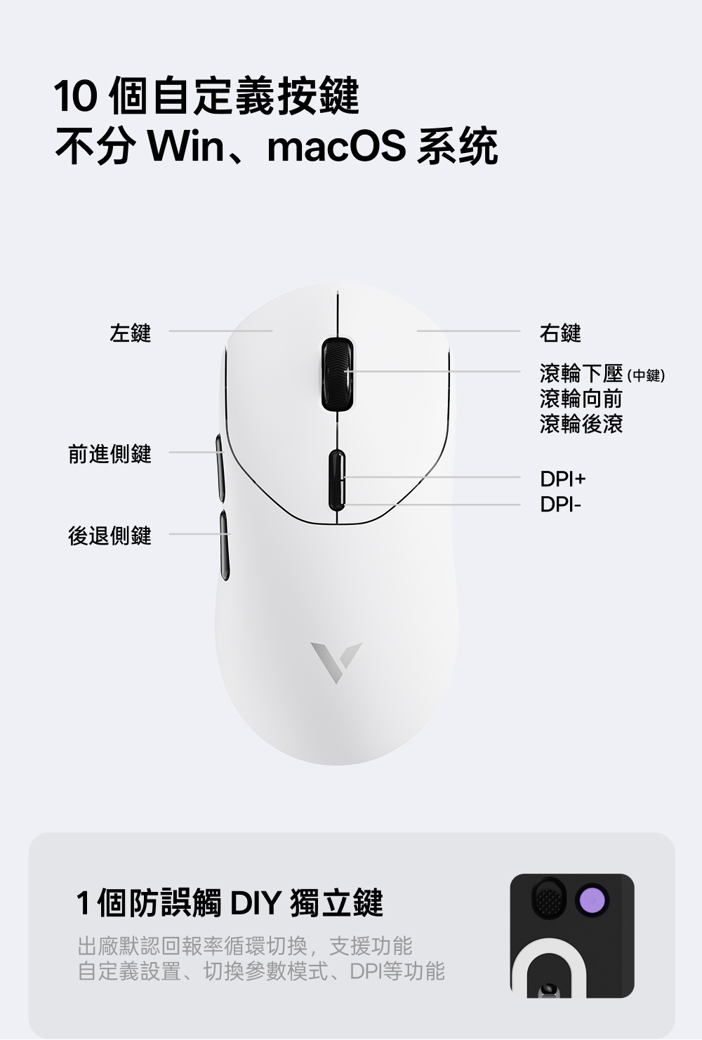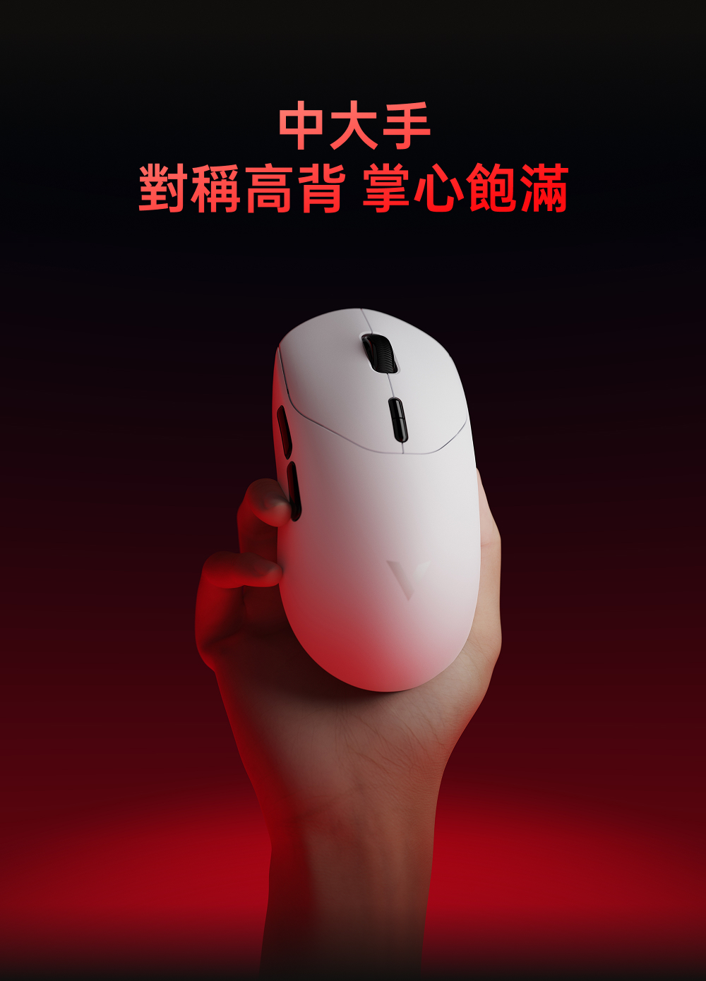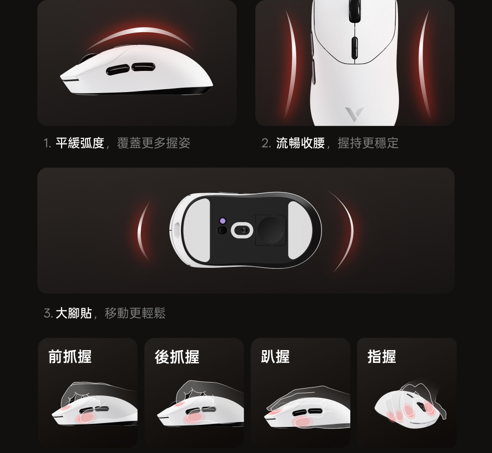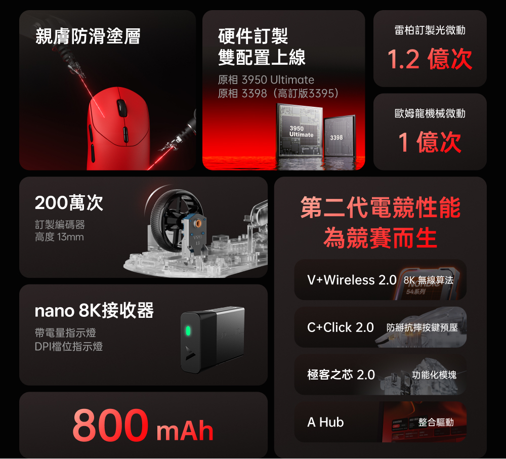 1.中大手適用 (對稱高背掌心飽滿) 2.800mAh電池500小時續航 3.nano8K接收器,自帶雙8KHz回報率,微型nano 8K接收器,即時電量RGB燈光顯示 4.原相3398(高訂版3395) 5.重量約53g 6.50-26000DPI 7.1億次歐姆龍機械微動 8.V+Wireless2.0無線技術 9.≧20000FPS 10.650IPS.50G加速度 11.200萬次TTC金輪特調度手感編碼器(13mm高度)
