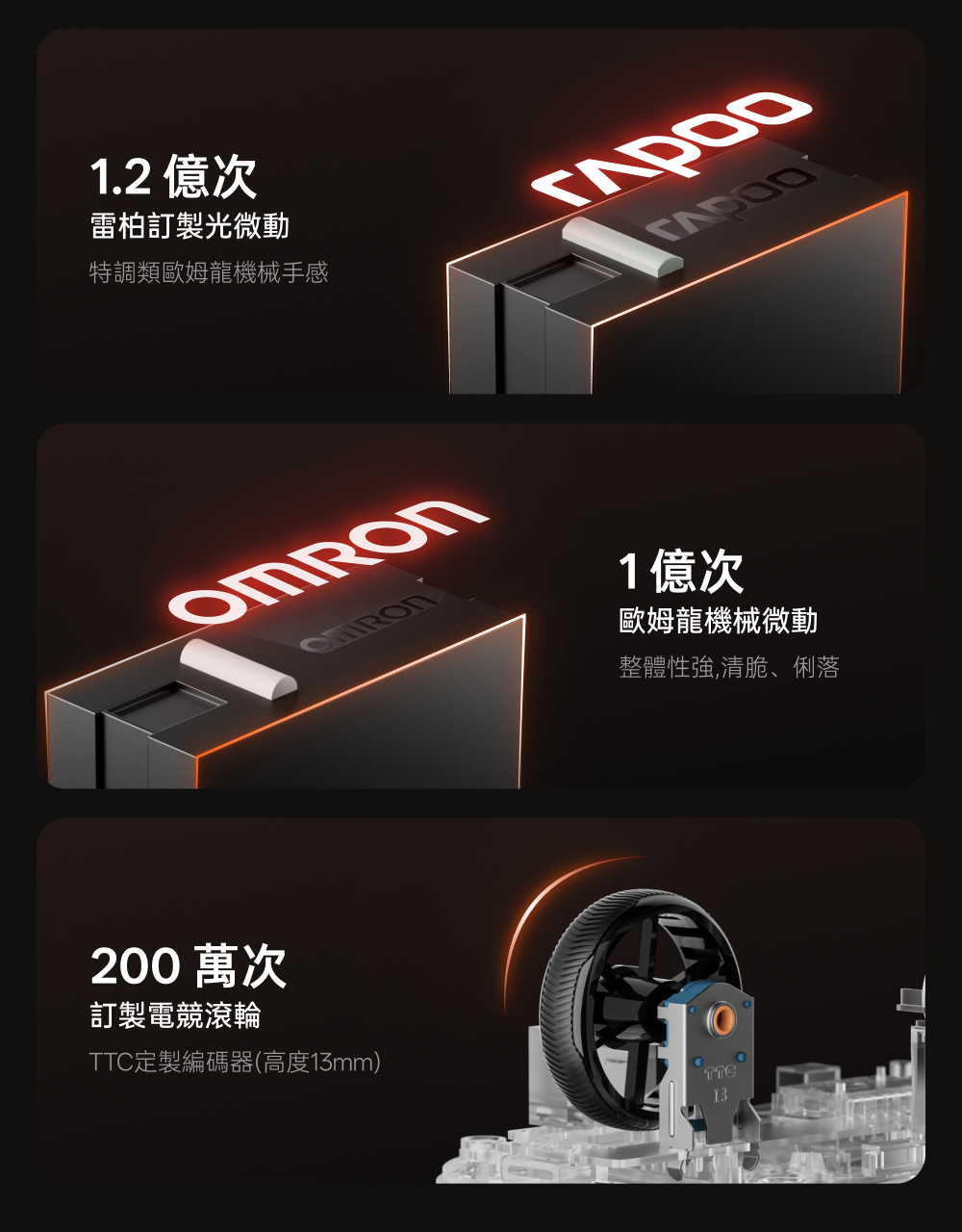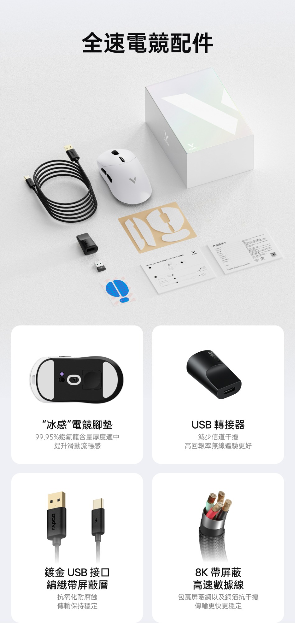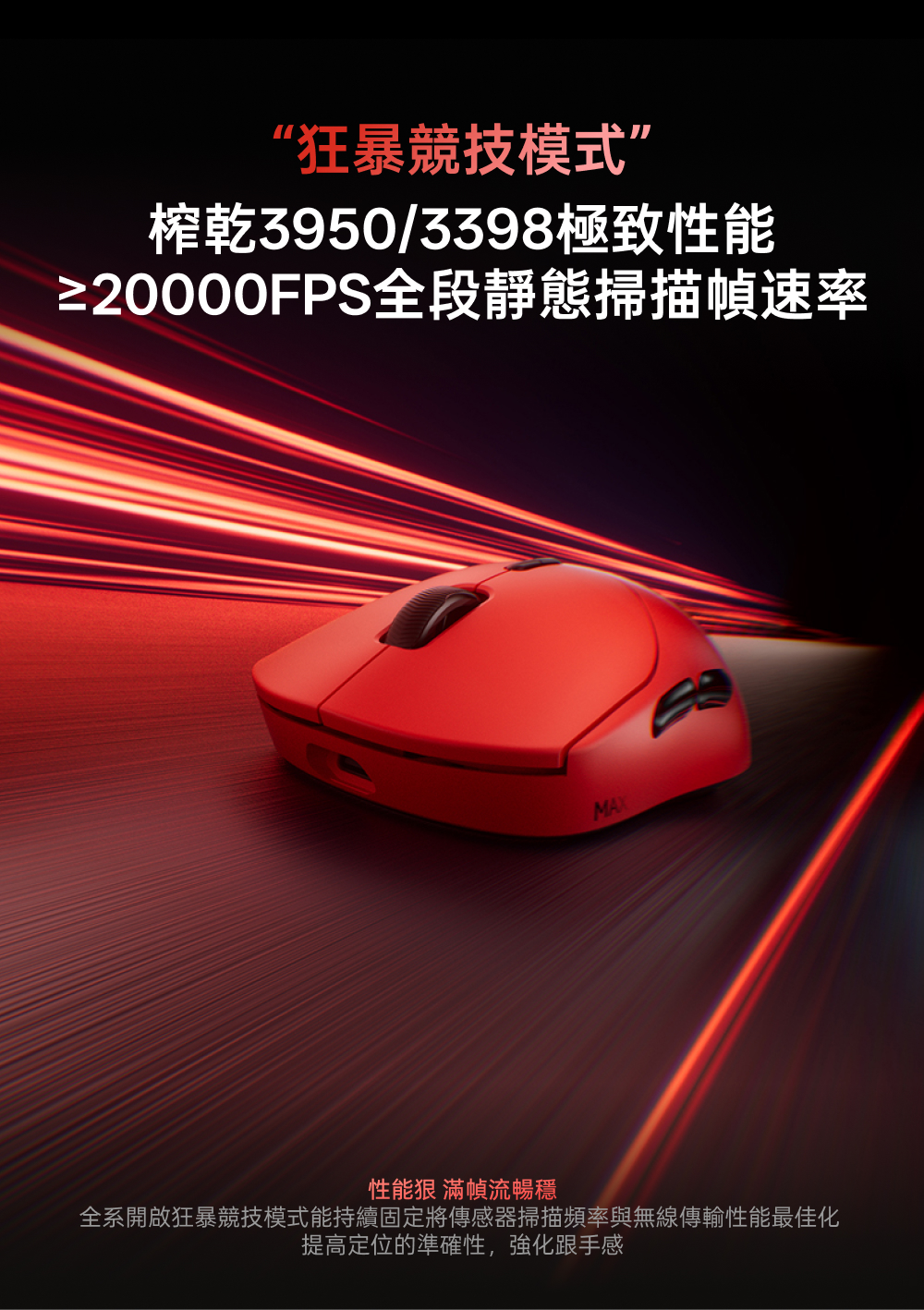 1.中大手適用 (對稱高背掌心飽滿) 2.800mAh電池500小時續航 3.nano8K接收器,自帶雙8KHz回報率,微型nano 8K接收器,即時電量RGB燈光顯示 4.原相3398(高訂版3395) 5.重量約53g 6.50-26000DPI 7.1億次歐姆龍機械微動 8.V+Wireless2.0無線技術 9.≧20000FPS 10.650IPS.50G加速度 11.200萬次TTC金輪特調度手感編碼器(13mm高度)