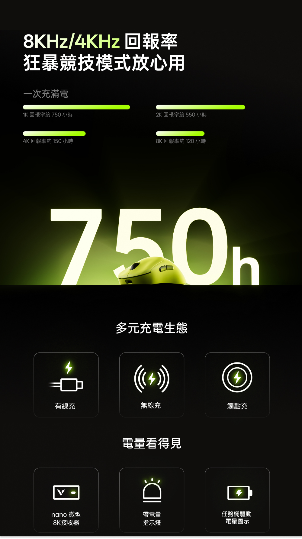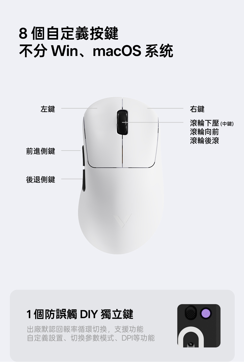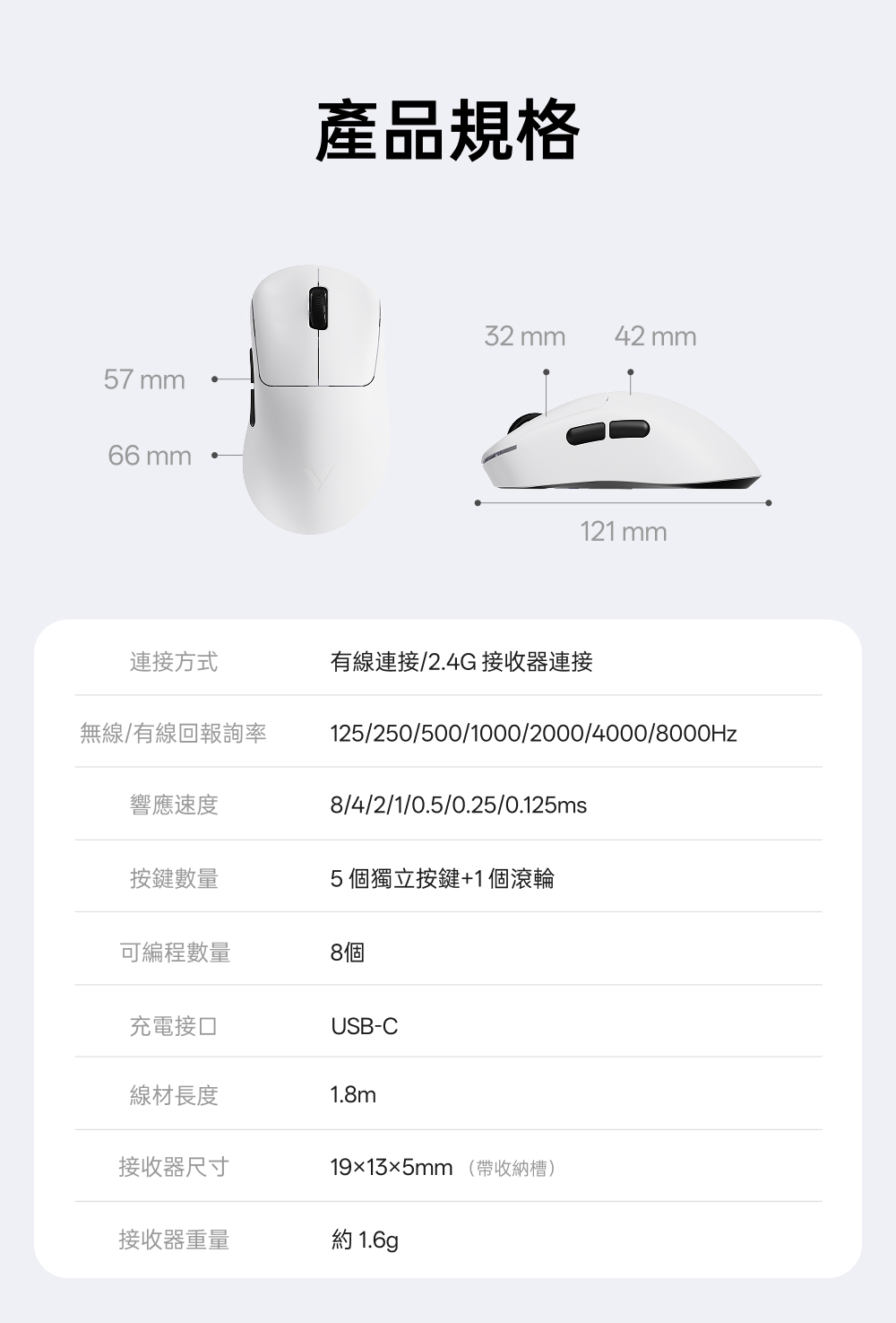 1.中小手適用 (右手適用) 2.800mAh電池500小時續航 3.nano8K接收器,自帶雙8KHz回報率 4.原相3398(高訂版3395) 5.重量約49g 6.50-26000DPI 7.1億次歐姆龍機械微動 8.V+Wireless2.0無線技術 9.≧20000FPS 10.650IPS.50G加速度