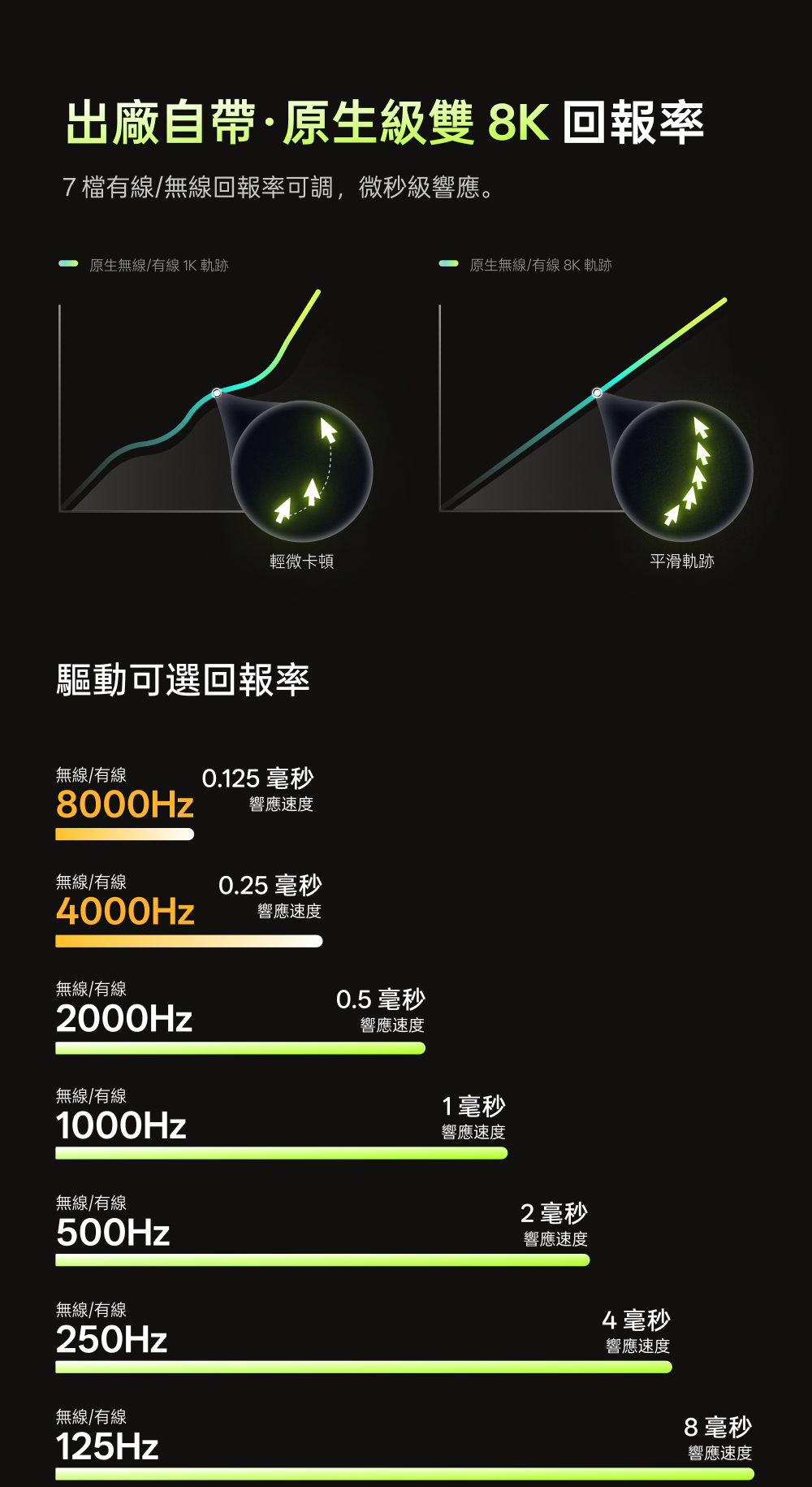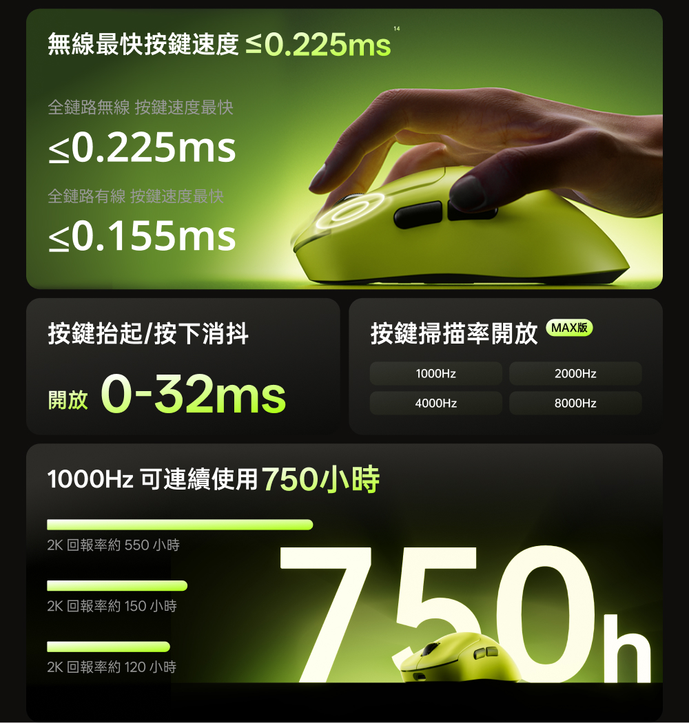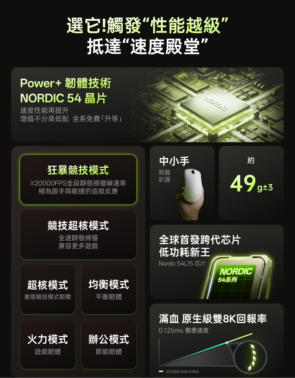 1.中小手適用 (右手適用) 2.800mAh電池500小時續航 3.nano8K接收器,自帶雙8KHz回報率 4.原相3398(高訂版3395) 5.重量約49g 6.50-26000DPI 7.1億次歐姆龍機械微動 8.V+Wireless2.0無線技術 9.≧20000FPS 10.650IPS.50G加速度