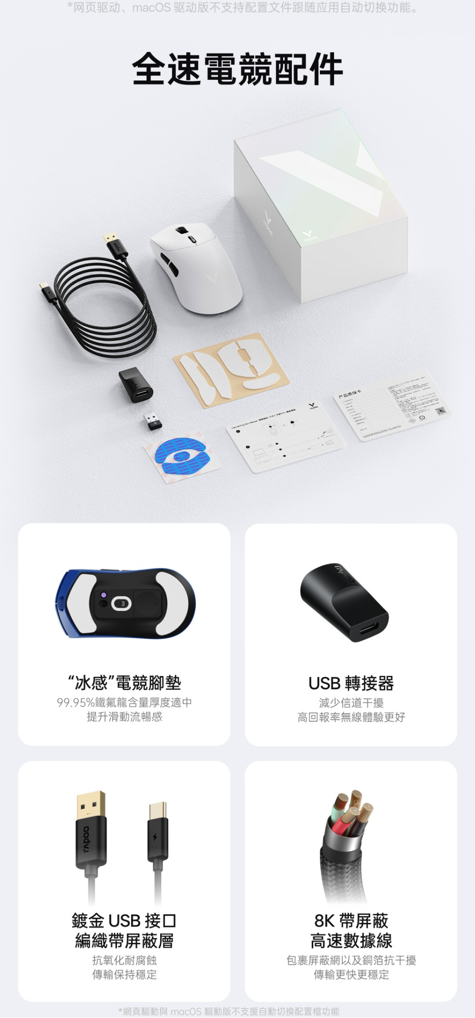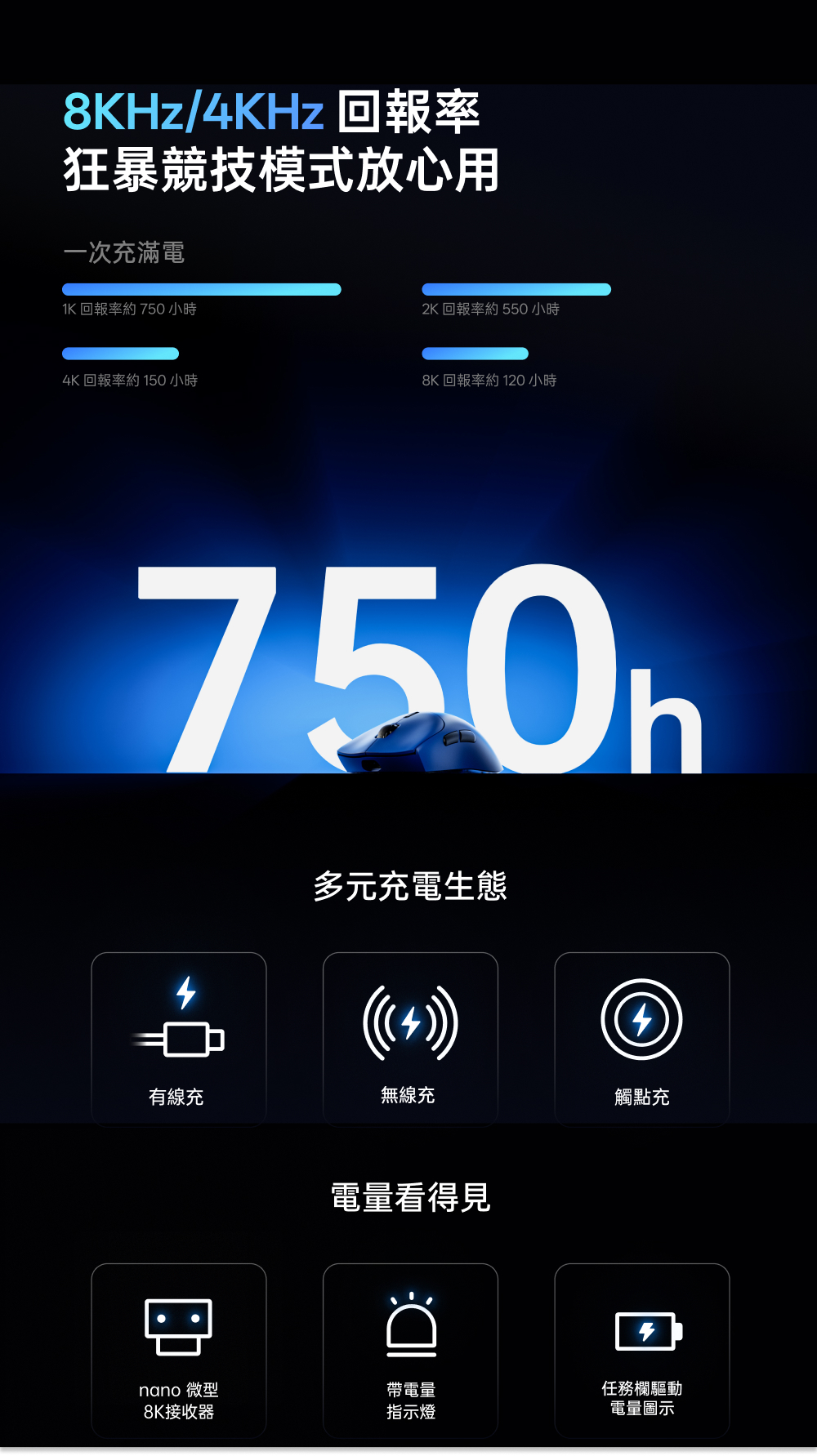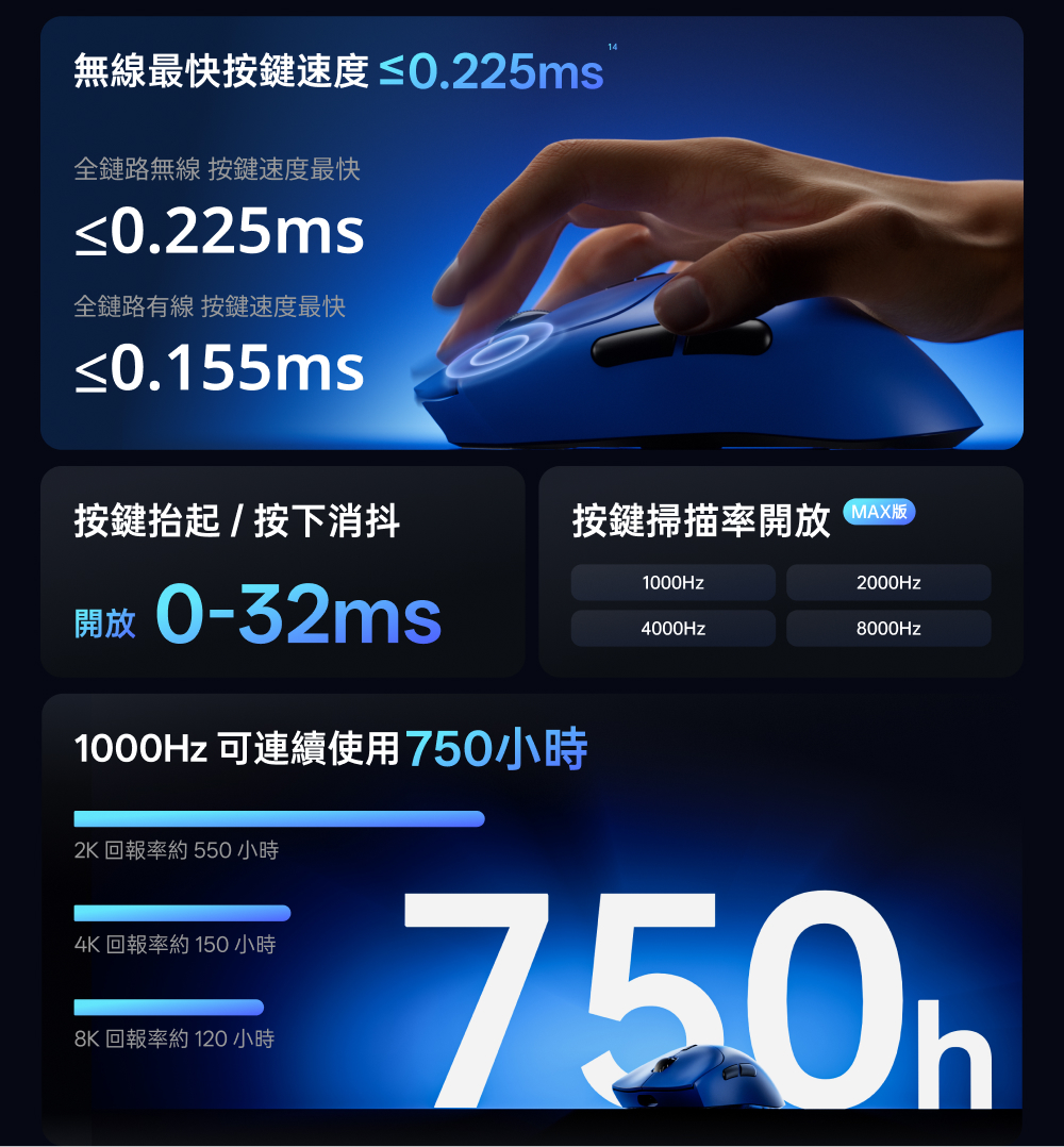 1.大手適用(對稱型雙手適用) 2.800mAh電池500小時續航 3.nano8K接收器,自帶雙8KHz回報率 4.原相3950 Ultimate 5.重量約53g 6.10-45000DPI 7.1.2億次雷柏制定光微動 8.V+Wireless2.0無線技術 9.≧20000FPS 10.750IPS.50G加速度,支援玻璃追蹤技術